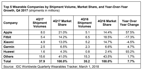 Därefter följer Fitbit med 5,4 miljoner skeppade enheter, Xiaomi med 4,9 miljoner och Garmin på en fjärdeplats med 2,5 miljoner. Huawei som säljer populära Android Wear-klockor med samma namn som Watch hamnar på femteplats med bara 1,6 miljoner enheter.