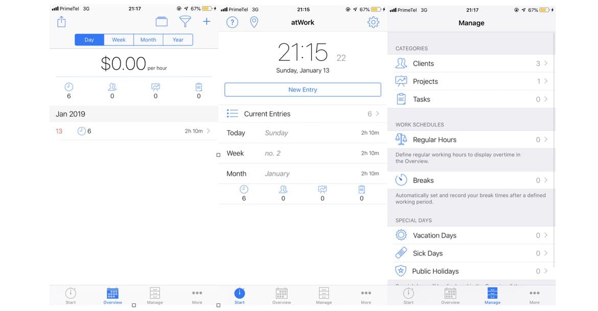 Om du i de två föregående apparna bara kunde specificera kunden och det projekt du för närvarande jobbar på, låter atWork dig koppla ditt timarvode till varje aktivitet. Det finns också en kategori av intäkter kallad ”bonus”, så att du även kan beräkna intäkter från dina projekt med fasta arvoden. Utöver arbetstiden går det också att registrera raster, semestrar och sjukdagar.