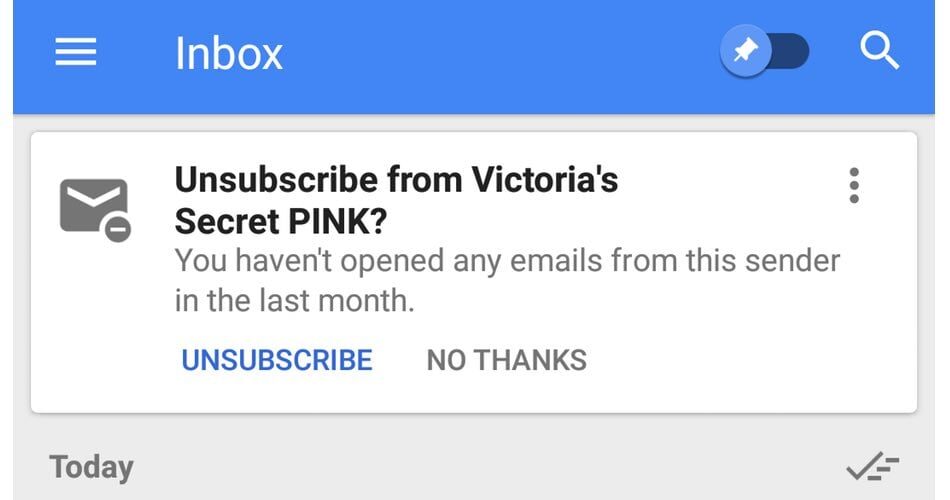 Du får sedan en notifikation när du är inloggad om att de snabbt kan avbeställas direkt via Google Inbox om du inte längre behöver dem. Det kan vara nyhetsbrev, rena säljmeddelanden från e-butiker eller dylikt.