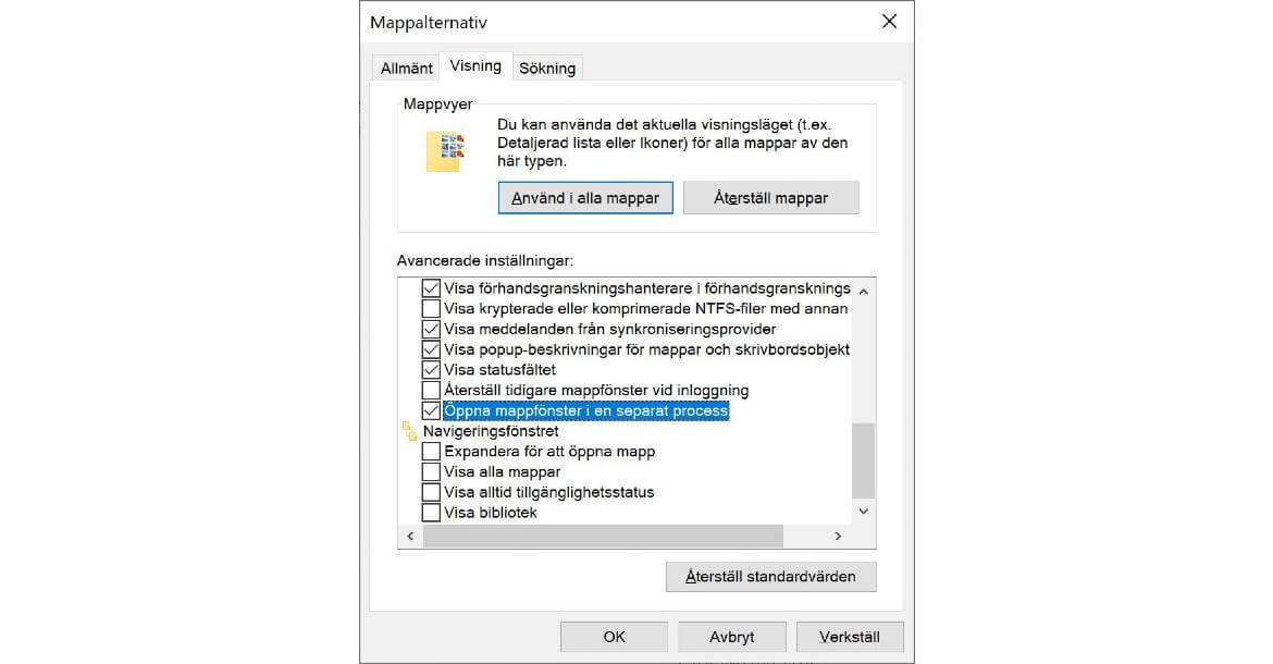 - Scrolla ner till ”Öppna mappfönster i en separat process”