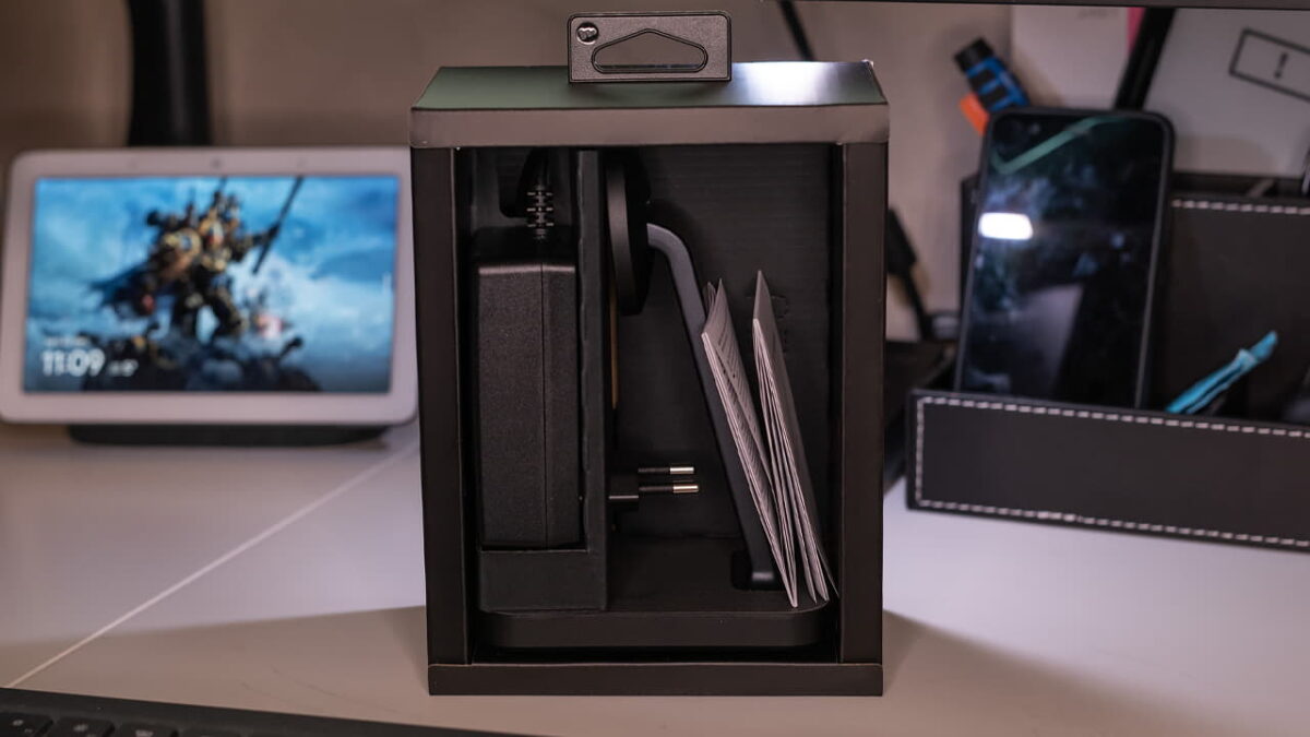 Själva laddhuvudet kan vinklas uppåt och nedåt så att du alltid har rätt vinkel på skärmen. Perfekt om du använder laddningsstället till kontoret när du har videomöten och växlar mellan stående och sittande position.