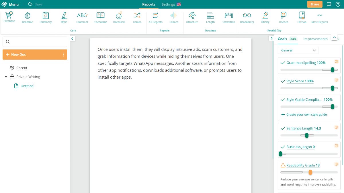 ProWritingAid är den kanske närmaste konkurrenten till Grammarly. Här får du allt som konkurrenten har och lite till. Och du kan prova många av dem helt gratis på de 500 första orden i dina dokument.