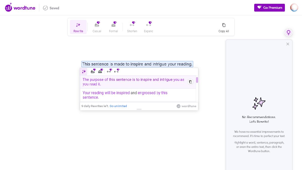 WordTune är inte ett rättstavningsverktyg i den meningen att du får stenkoll på alla felstavade ord eller passiva meningar. Istället fokuserar WordTune på att skriva om hela meningar så att de låter bättre eller bara ser annorlunda ut mot originalet.