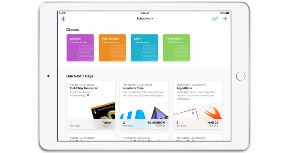 Med nya iPad 9.7 som har stöd för Apple Pencil erbjuder Apple ett billigare och smartare alternativ än tidigare – och en av de stora säljpunkterna med surfplattan är appen Schoolwork. Den gör att lärare och elever får en digital samlingspunkt och kommunikationskanal som integreras med surfplattan och nya iWork-sviten.